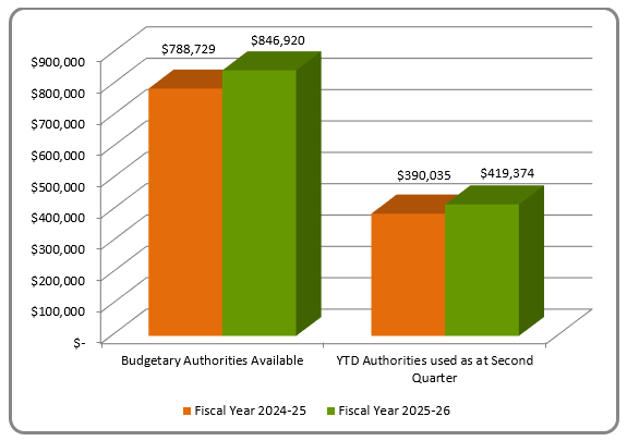 As at September 30, 2024 and 2025, FJA’s total authorities available were $788,728,803 in 2024-2025 and $846,920,192 in 2025-2026. Authorities used as at the second quarter totalled $390,034,593 in 2024-2025 and $419,373,760 in 2025-2026.