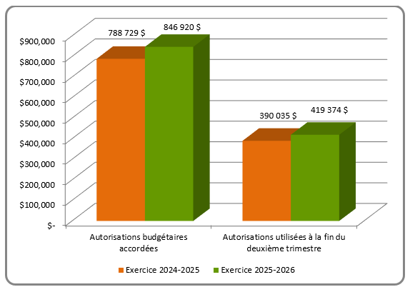 En date du 30 septembre des années 2024 et 2025, les autorisations totales disponibles du CMF s’élevaient à 788 728 803 dollars en 2024-2025, et 846 920 192 dollars en 2025‑2026. Les autorisations utilisées à la fin du deuxième trimestre totalisaient 390 034 593 dollars en 2024-2025 et 419 373 760 dollars en 2025-2026.