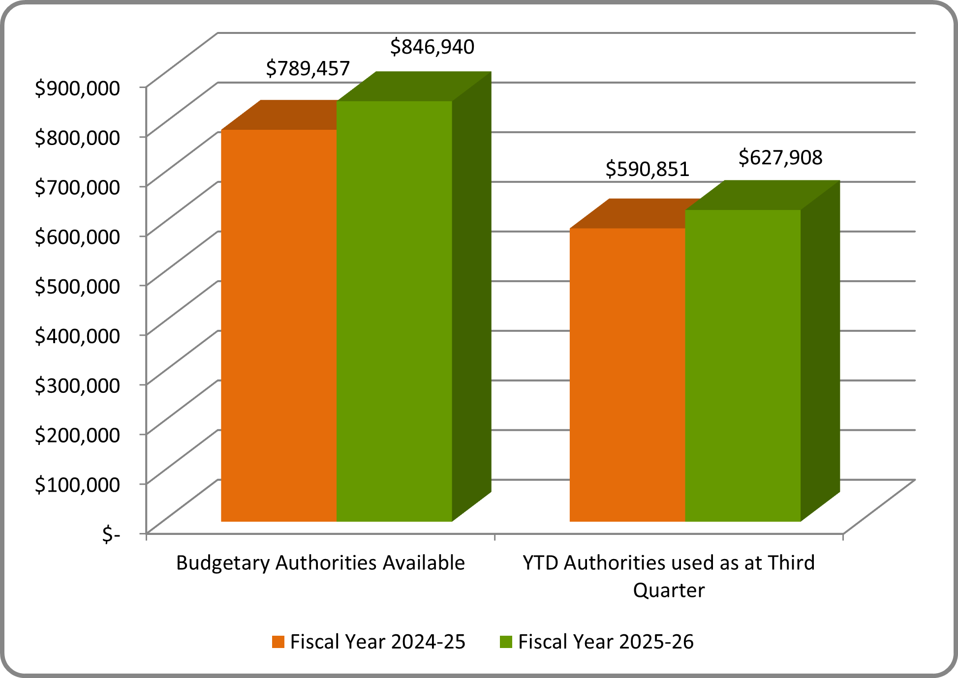 As at December 31, 2024 and 2025, FJA’s total authorities available were $789,456,865 in 2024-2025 and $846,940,037 in 2025-2026.  Authorities used as at the third quarter totalled $590,851,238 in 2024-2025 and $627,908,092 in 2025-2026.